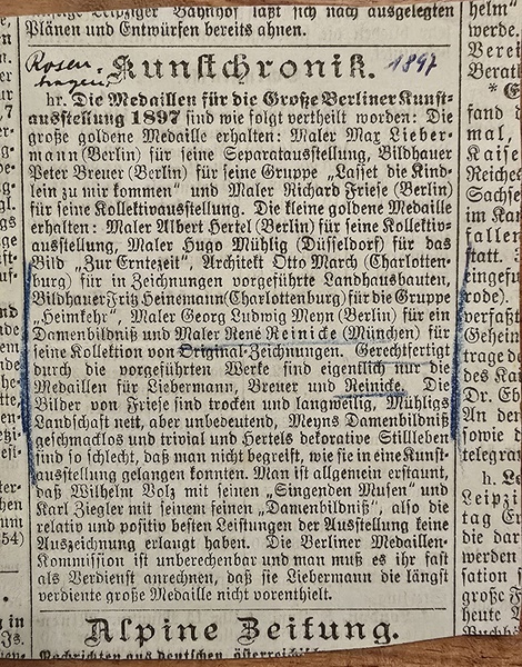 1897 Kleine Goldmedaille auf der Großen Berliner Kunstausstellung